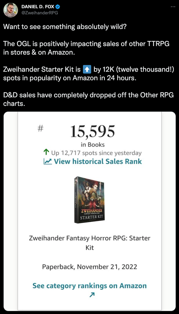 The maker of Zweihander posted exact sales numbers for their starter kit. 884, Jan 14th to Jan 27th. At a sales rank of 48866 at $27. I’ll go look if there is another cap of sales rank from earlier.