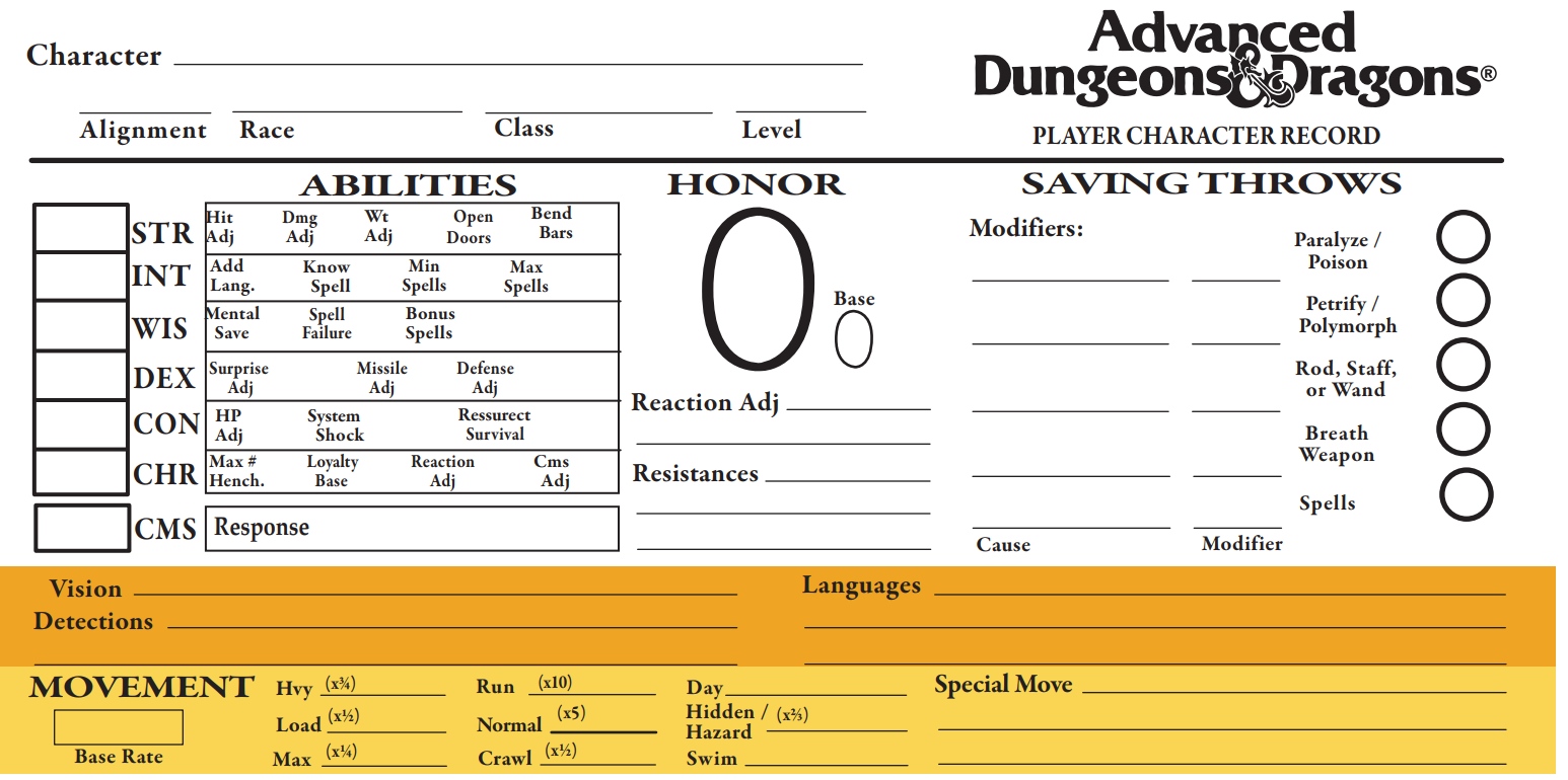 But now that I'm playing an OD&D/AD&D mash-up with a system of nine base classes, I'm arranging the stats in a different order — Str, Wis, Cha, Dex, Int, Con. I'm doing this for largely the same reason that the original game used its order: to help conceptually organize how the character classes fit into an adventuring party. The first three stats — Str, Wis, Cha — are the prime requisites for the commonest character classes, Fighter, Mage, and Cleric. The next three — Dex, Int, Con — are for the more support-oriented classes, the Thief, Artificer, and Monk. And the stats pair off for the remaining three rare classes — Str & Wis for Rangers, Cha & Dex for Minstrels, and Int & Con for Psionicists.