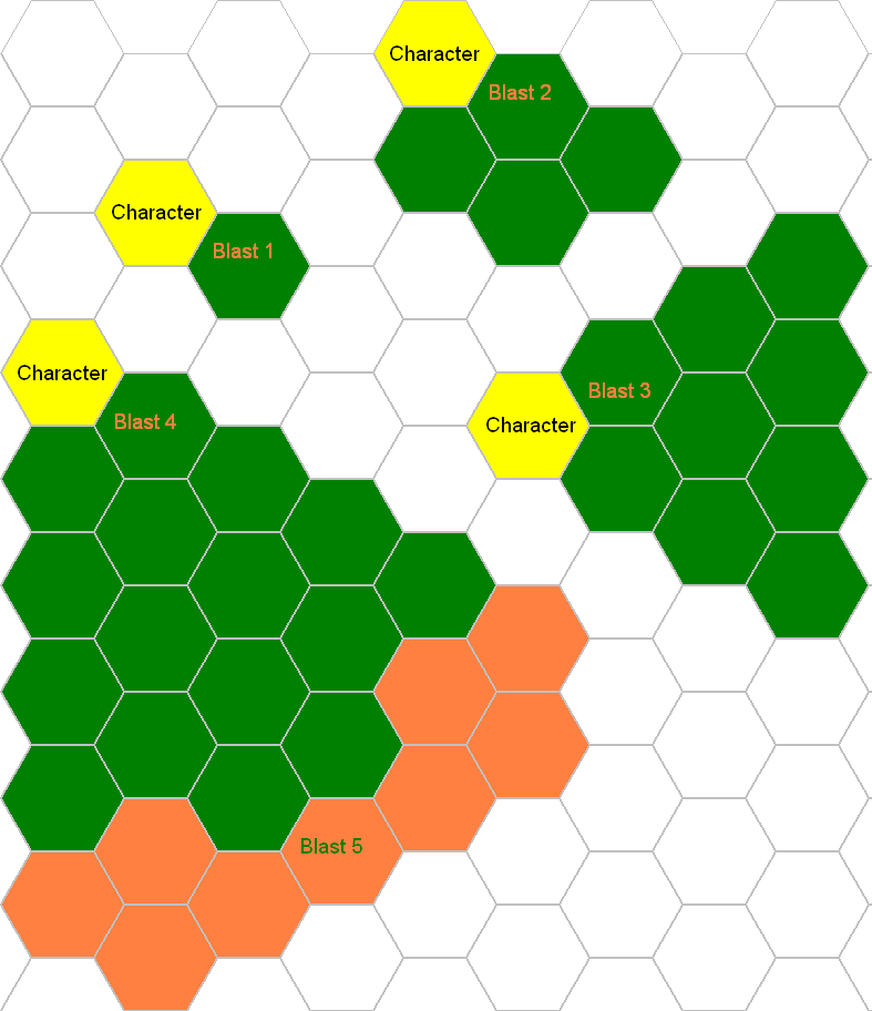 C) Blasts are fine, just make sure the number of squares is equal to the blast rate. For example, Blast 3 is a 3x3 which equals 9 squares, so your blast should equal 9 hexes. Blast 5 is 25 squares, so your blast 5 should equal 25 squares.