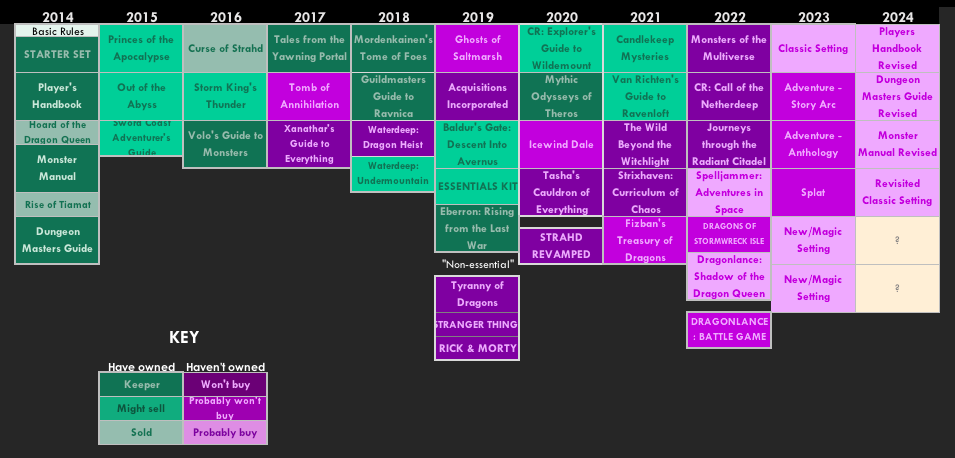 Honestly what I see from that is that you buy a consistent average of about two to three books per year - and as WotC has been putting out more this hasn't changed.Out-nerding you all. I took my 5E product chart, and color-coded it based upon my ownership: