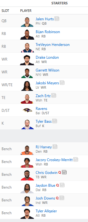 Your bench is interesting. You have some some choices of high-impact players that you get cheap due to injury but will come on-line later (Godwin), a necessary handcuff (Allgeier), a completely unproven player who might end up absolutely crushing it as a Top 10 fantasy pick, or disappear into a timeshare or doghouse (Harvey), a player I love that would have been a good sleeper if they hadn't inserted Danny "Dead Arm" Dimes into the starting lineup (Downs), and what I hope was your last pick (after your kicker), because I had a serious WTF moment (Jacory Croskey-Merritt).