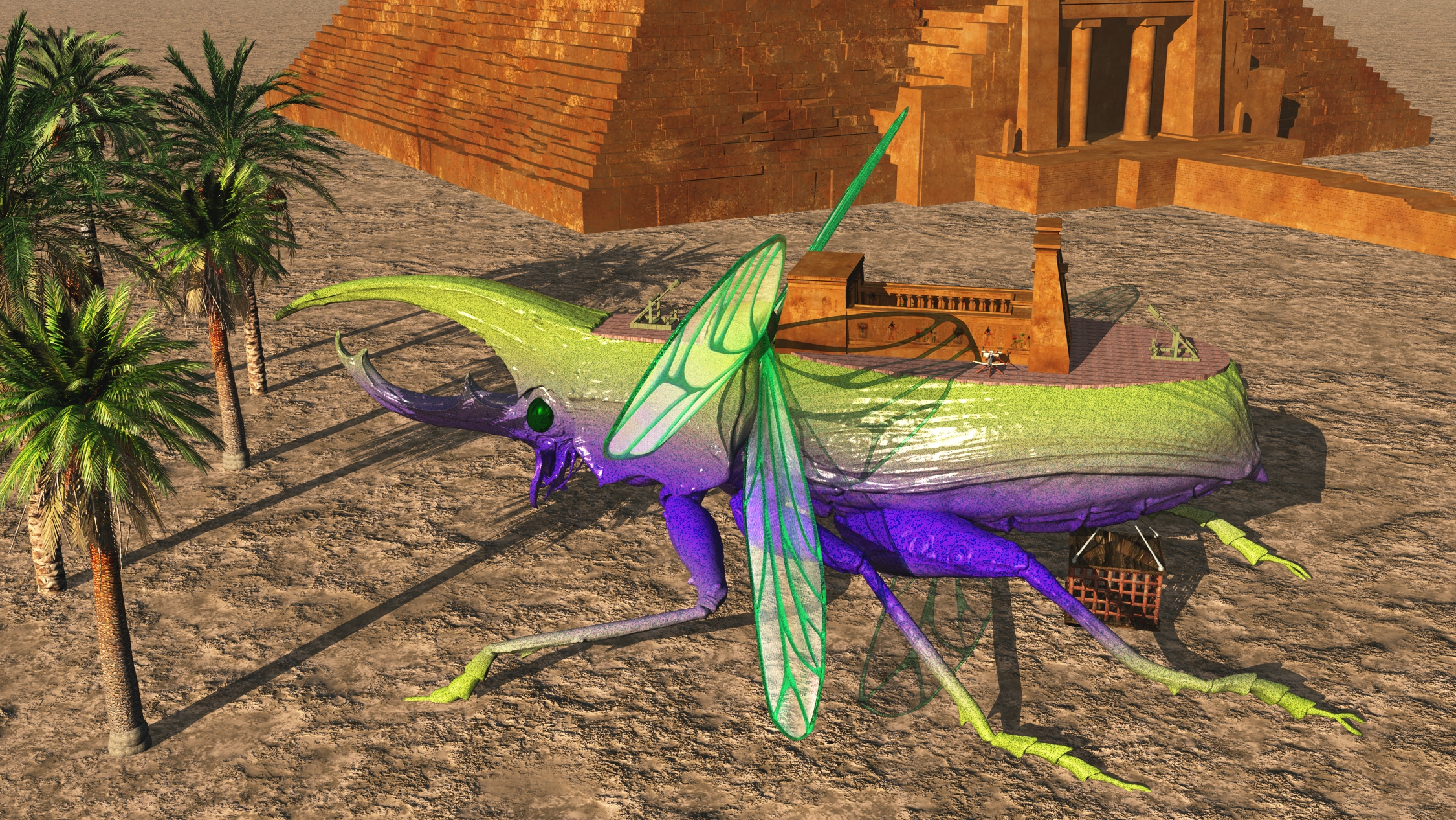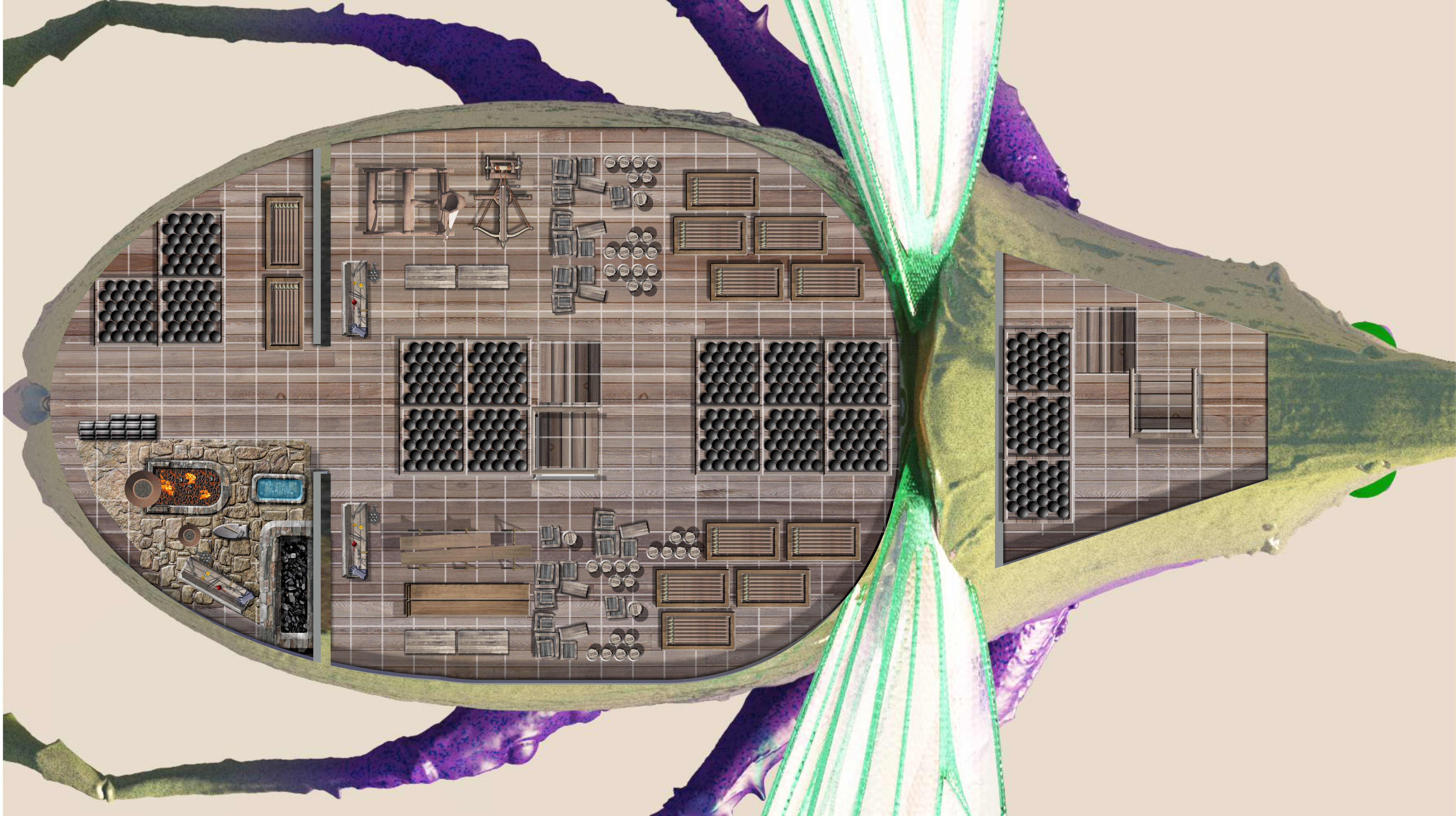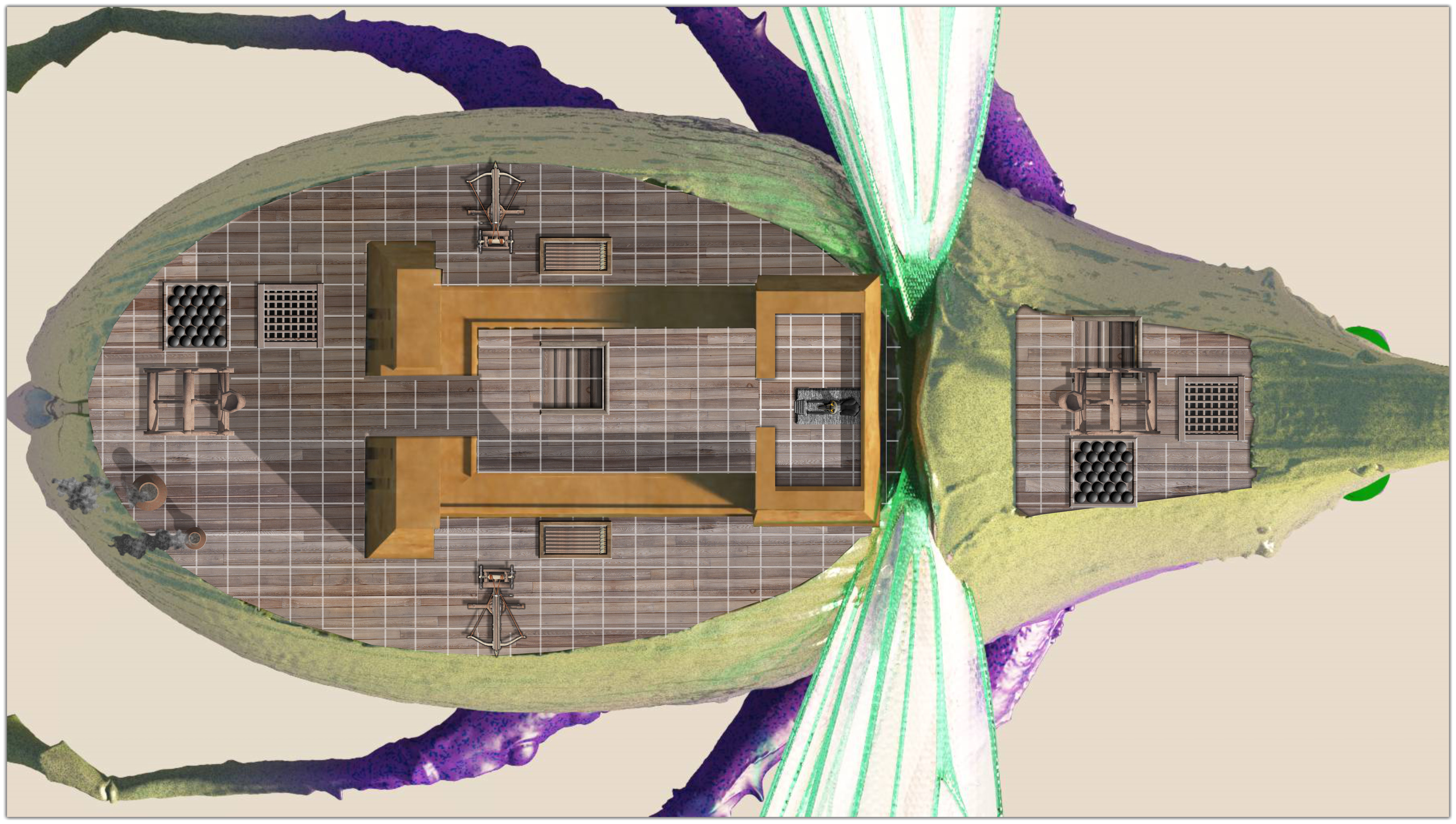 Shown below is the Anubian Scarab Spelljammer destroyer, then the 4 decks: top deck gunnery and temple, deck two is gunnery support, deck three is crew quarters and helm, deck four is the cargo stores and slave pens (Anubians are jackal headed gnolls, evil slavers that worship Anubis).
