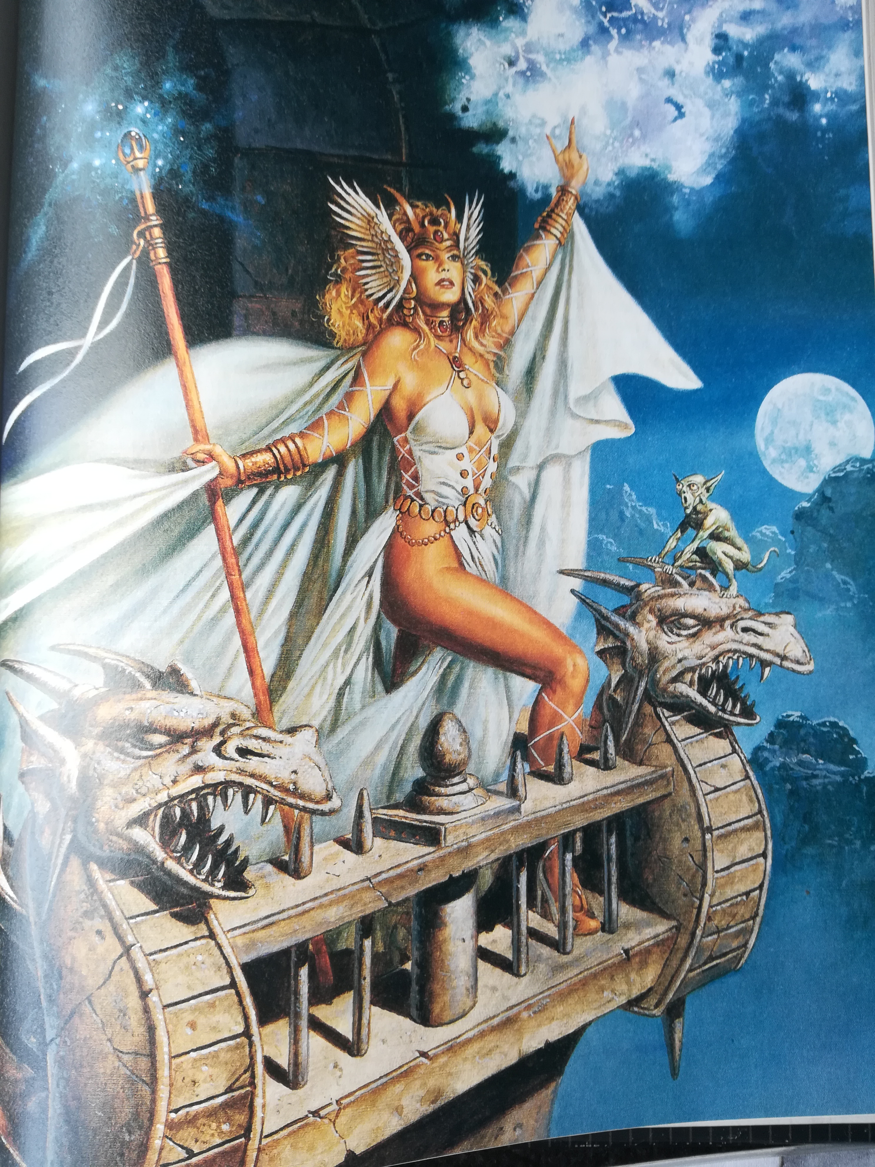 What is this piece trying to say? We have this nice gothic architecture under a full moon - very Dracula looking. Then, we plonk down a blond, blue eyed woman dressed in virtually nothing, doing... magic? on the balcony while some little imp critter gapes at here open mouthed, practically drooling.