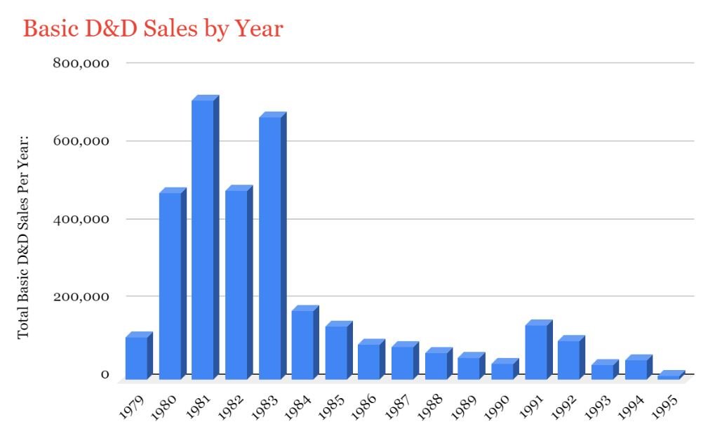 Recently Ben Riggs shared some sales figures of AD&D 1st Edition. Now he has shared figures for Basic D&D from 1979-1995, and during the early 80s is was selling 500-700K copies per year.