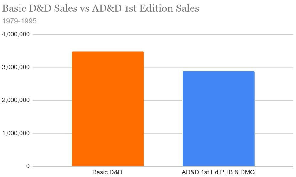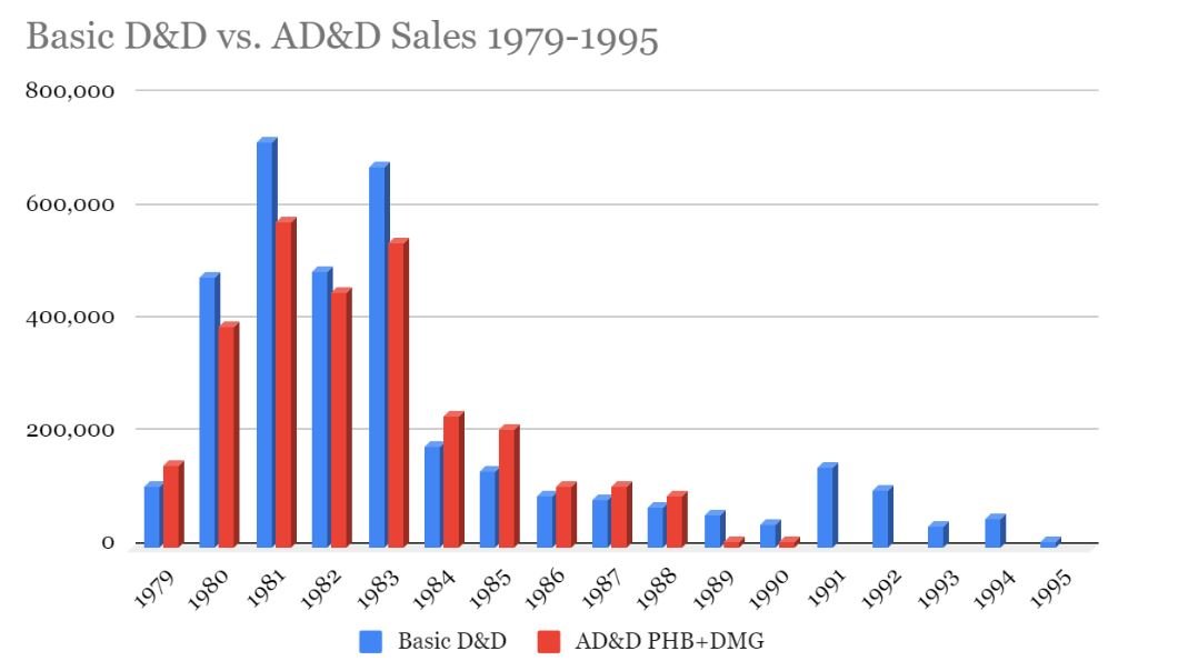 If you take a look at the overall sales from 1979-1995, here are the two beside each other (again, this is just PHB and DMG, so it doesn't include the Monster Manual, Unearthed Arcana, etc.)