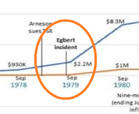Below you will find the sales numbers of Basic D&D, and then two charts comparing those to the sales of AD&D 1st edition. For those who don’t know, early in its life, the tree of D&D was split in half. On the one side there was D&D, an RPG designed to bring beginners into the game. It was simpler, and didn’t try to have rules for everything.