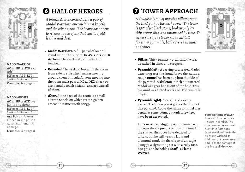 If I may nitpick, area 6 didn't work perfectly for me. The italics at the top of the page are what I'd read to get a sense of the room. The fact that the room is crowded with skeletons seems like a key point, and I might miss that if I'm just skimming. It took me a bit of reading and rereading to grasp that the "madoi warriors" and "crowded" sections were actually referring to the same thing.