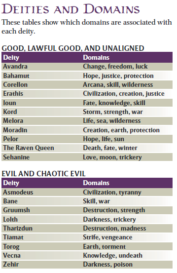 Ok, so here is an idea I had: give each god a domain from DMG (+Arcana, Law and Chaos). playable species they're patrons of, class they're patron of.