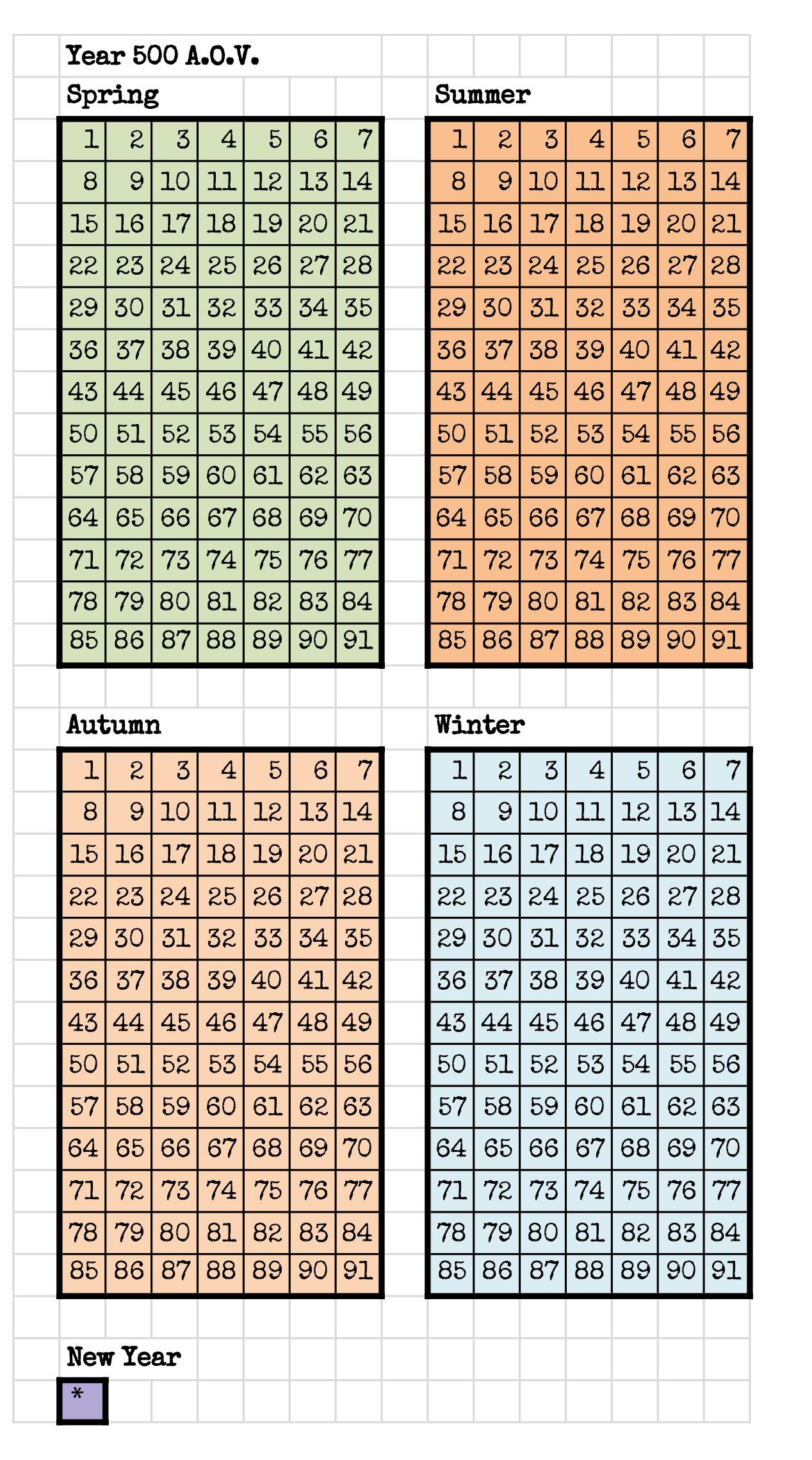 Frequently throughout the modules it references Months. however it is shown that the calendar is 4 Seasons of 91 days each with a single day for new year. Each season comprising 13 weeks.