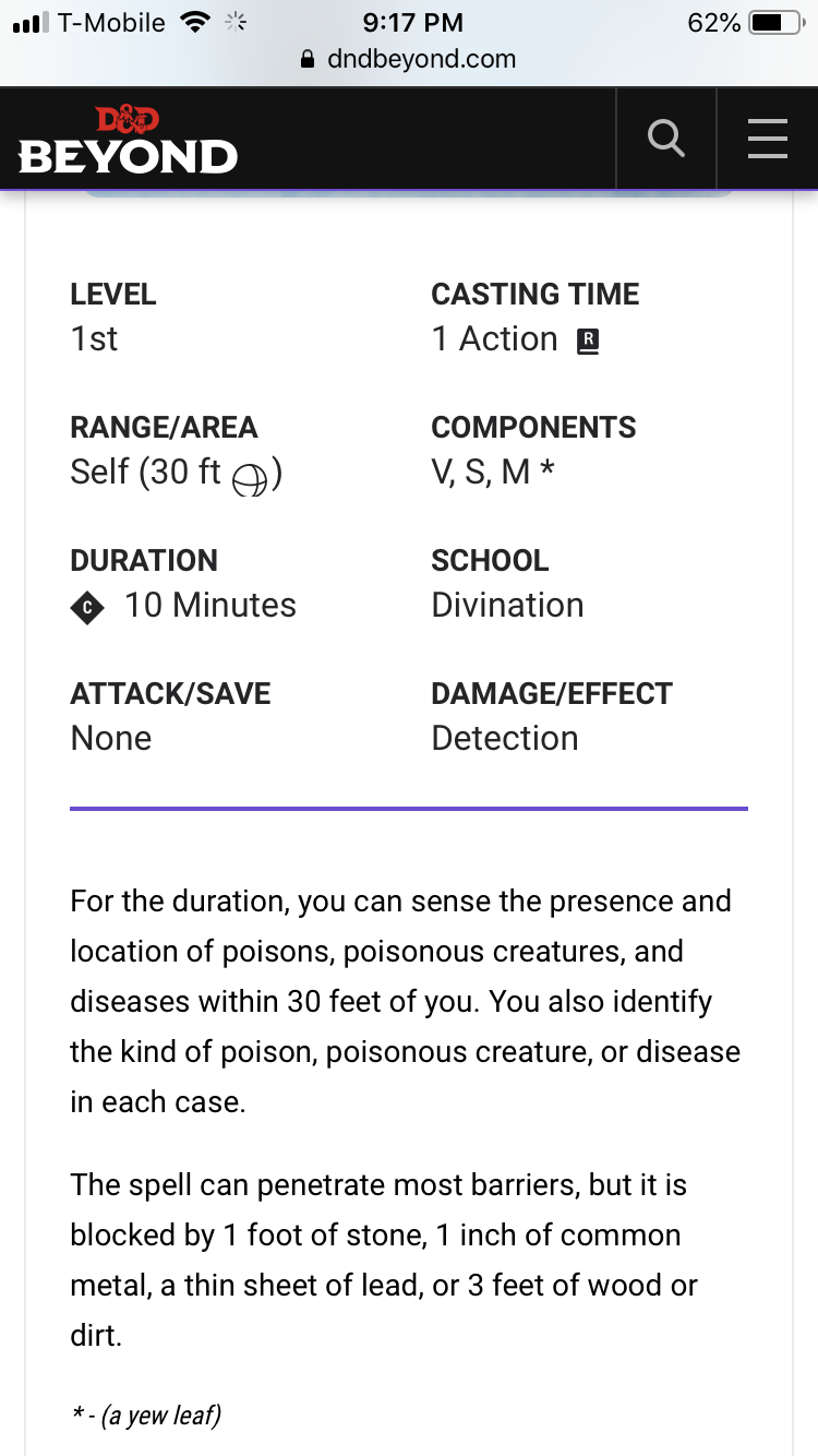 So, 30 ft, 10 minutes at a time, as a Ritual. Detects not only the presence of disease and poison, but also what kind each one is.