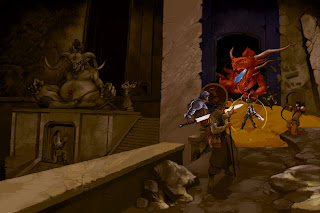 We have uploaded the latest version of the Players Handbook 5th Printing over on the Kickstarter Page. You'll notice the Demon Lord (Unklar) sketched into the back cover as a statue. Peter plans on putting a few thieves climbing up the statue and prying his jeweled eyes out...even as the dragon explodes through the other door.