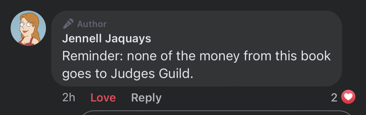 I emailed backerkit, who then forwarded to the creators about whether any money from this crowdfund was going to Judges Guild. And also said if yes, I wouldn't back (and I REALLY WANT TO BACK).Those would be huge announcements, since they've promised not to work with the Bledsaws any more. So either Goodman is breaking his word, which seems out of character, or it would mean they're buying parts of the Judges Guild catalog, rather than licensing them, which would be big, big news.