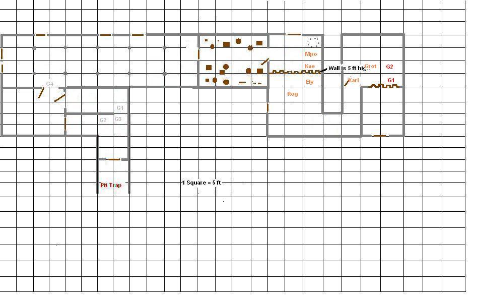 Several long minutes later, when things have again grown quiet, Karl is the first to speak. "Well, that was close. I'll try the door at the end of the hall." Karl sets about searching the floor of the hall and, ten feet before the door at the end of the hall, comes to an abrupt stop with a low whistle. "Found something, alright. Looks like another trap." Pushing at a bit of stone, Karl wedges a loose flagstone into a crevice so that the flagstone stands upright. "Don't trip on that tile." Pointing to a 10-foot square section in front of the door at the end, Karl says, "There's a pit trap just there. I've wedged that stone in so that it should keep the floor steady. We can cross, I think."