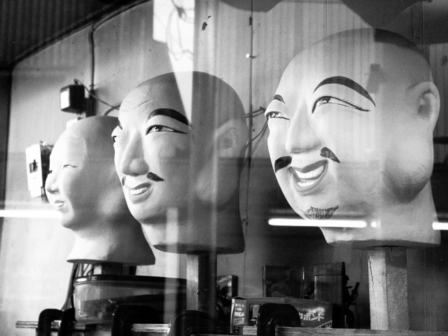 Shoji dashed past the ice cream stand, tilt-a-whirl, and merry-go-round before seeing his counterpart sitting slouched on a park bench. He was watching what Shoji presumed to be their mark: a woman dressed in a heavy kimono and a noh mask who was reciting her lines in time to a walking bass line that emanated from a speaker off to one side. At her feet was a golden bowl, which passers-by occasionally dropped a few newyen into.