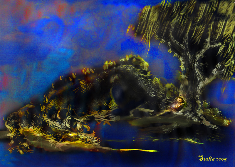 The next Tuesday, the great mechanical beast never arrived to take Esmeralda to the moon. She waited by the lily pond until the sun completed its circuit of the sky, and then went in side. After dinner, she did her homework, fed her dragon, and then put on her pajamas. The crickets chirped outside her window, and the light of the moon cast long shadows across her bed.