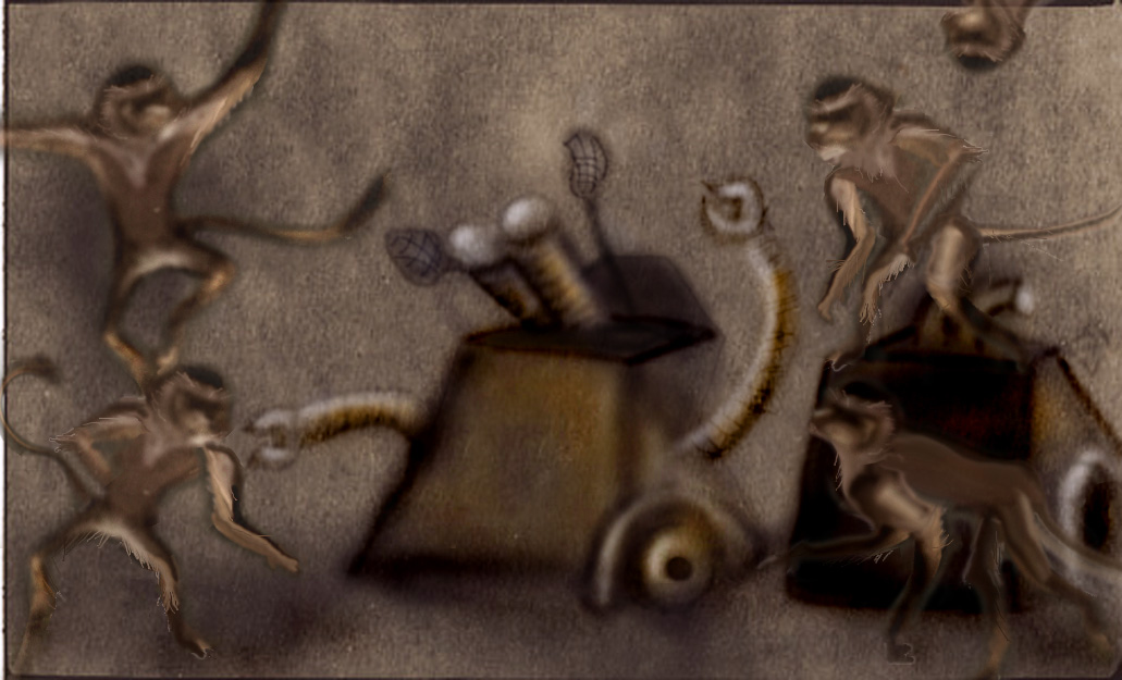 “You primates!” she yelled as her pneumatic-powered arms pummeled the monkeys. “Leave her alone!”