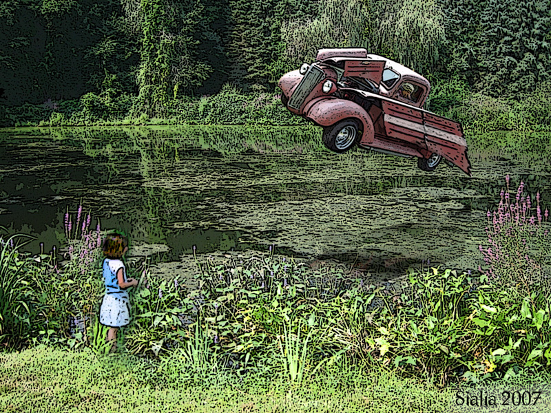 It resembled an old truck: red and rusted and clunky; but where it should have had side panels, it had wings that flapped up and down with a loud creak. When it landed, it blinked one of its headlights and wiggled its bumper at her.