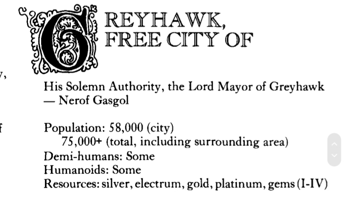 "This walled town was the area trade center and seat of feudal power, then began to decline when the overlordship transferred from a suzerain to the city itself, but is now undergoing a boom due to the ac- tivities of adventurers and the particular world system events (a new struggle between lawful good and chaotic evil, with the latter on the up- swing). The oligarchs of the city are neutral in outlook, if not in align- ment, viewing anything which benefits their city as desirable. There- fore, all sorts of creatures inhabit the city, commerce is free, persons of lawful alignment rub elbows with chaotics, evil and good co-exist on equitable terms. Any preeminence of alignment is carefully thwarted by the rulers of the place, for it would tend to be detrimental to the city trade. There are movements and plots aplenty, but they are merely a part of the mosaic of city intrigue, and player characters can seldom find personal advantage in them, let alone assume a commanding posi- tion in municipal affairs. (Gary Gygax, "Varied Player Character and Non-Player Character Alignment in the Dungeons and Dragons Campaign" The Dragon #9 (Vol II No. 3) 1977.)