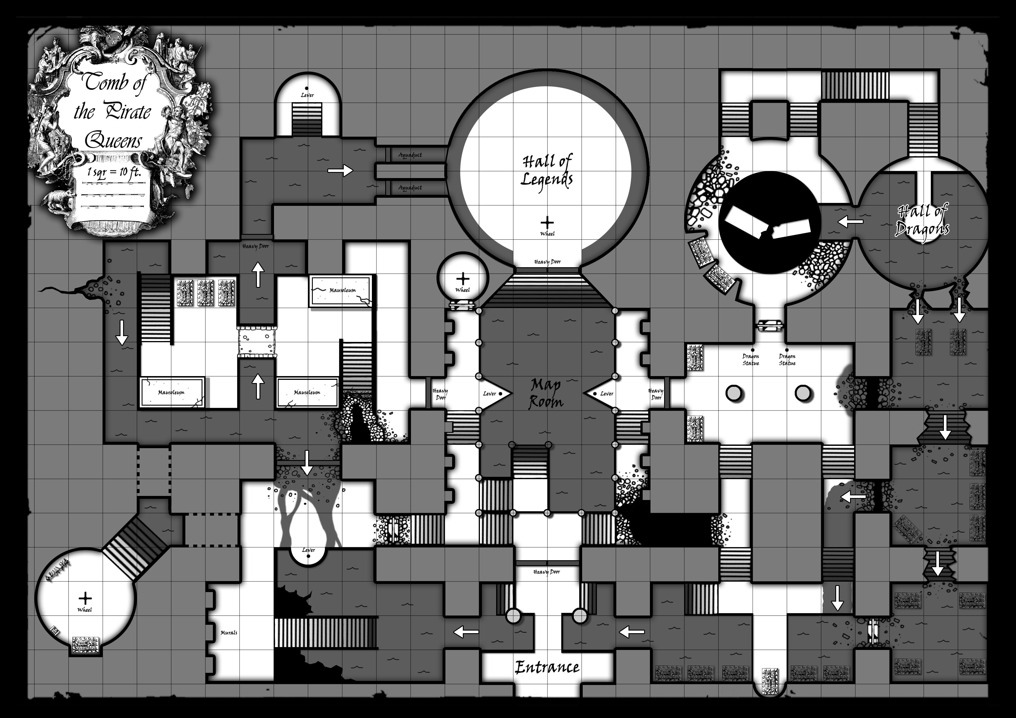 I then use clip art from the classic board game Hero's Quest, to indicate the positions of tombs, doors and furniture. But I suppose you could use just about any RPG clip art that you fancy. You don't need to be an artist to create cool looking maps. Staircases and pillars are made with the stroke tool as well. But for the stairs I create an extra layer so that the stairs have a gradient from white to black, to suggest depth (also by using the blending options).