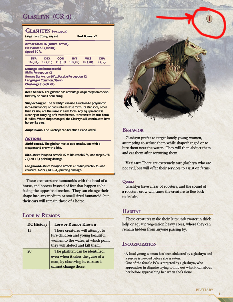 Something like that - yes, fine. That particular placement doesn't seem bold enough - I'd put the ! by the name or 'behavior' section.So something more like this? I think I like this better than the "CONTENT WARNING" text. (Also, the icon would appear in the Author's Note paragraph, so it would be defined there. Also ignore the CR4 and CR2 disparity; this was a quick mock-up)