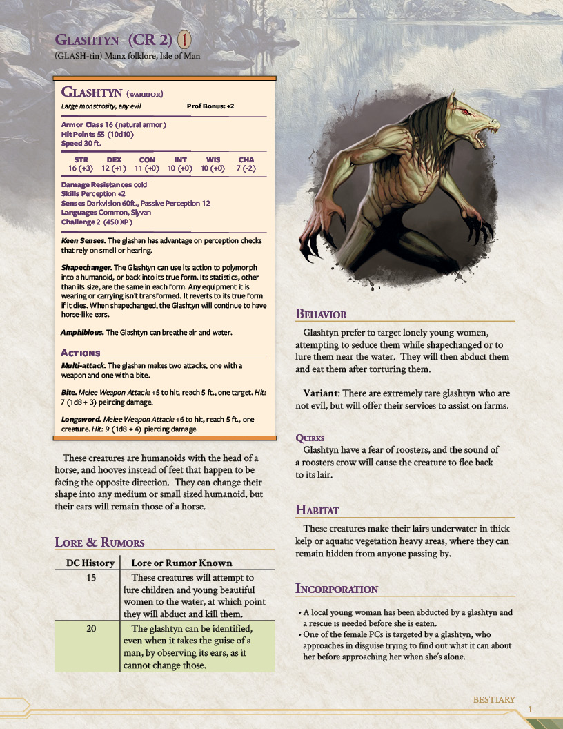 Author's Note: Because the purpose of this book is to capture the original stories and portrayals of the creatures of folklore, there may be issues that are considered problematic by modern standards. Most of these myths and fables were created in a time or culture where issues such as misogyny, ethnic stereotyping, and ableism were part of the story, whether directly or indirectly. This book does not endorse any of these beliefs, and it is encouraged that any aspect you may find problematic for your game be modified or ignored. There are a lot of potential great stories to be told using original myths, but we must also be willing to acknowledge problematic aspects of those stories. Take what you want from this book, and ignore the rest.