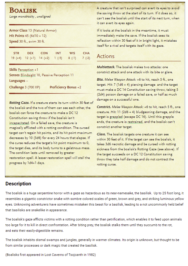 Glare. The boalisk targets one creature it can see within ## feet of it. If the target can see the boalisk, it takes 3d6 necrotic damage and be cursed with rotting sickness from the boalisk's Rotting Gaze (see above). If the target succeeds on a DC ## Constitution saving throw they take half damage and do not contract rotting sicking.