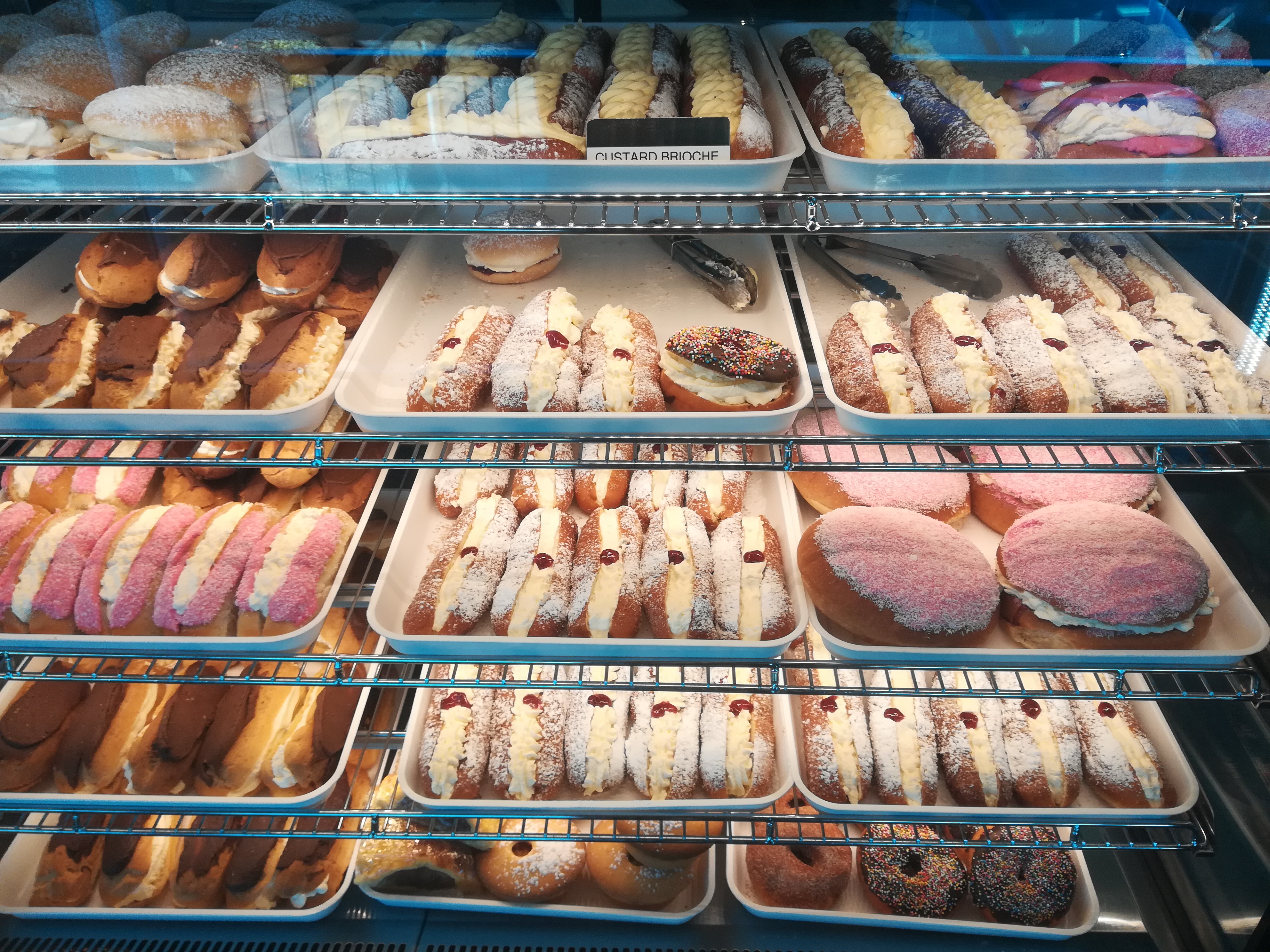 Sweet stuff. Donuts, cream buns,Boston buns,chocolate eclairs etc.