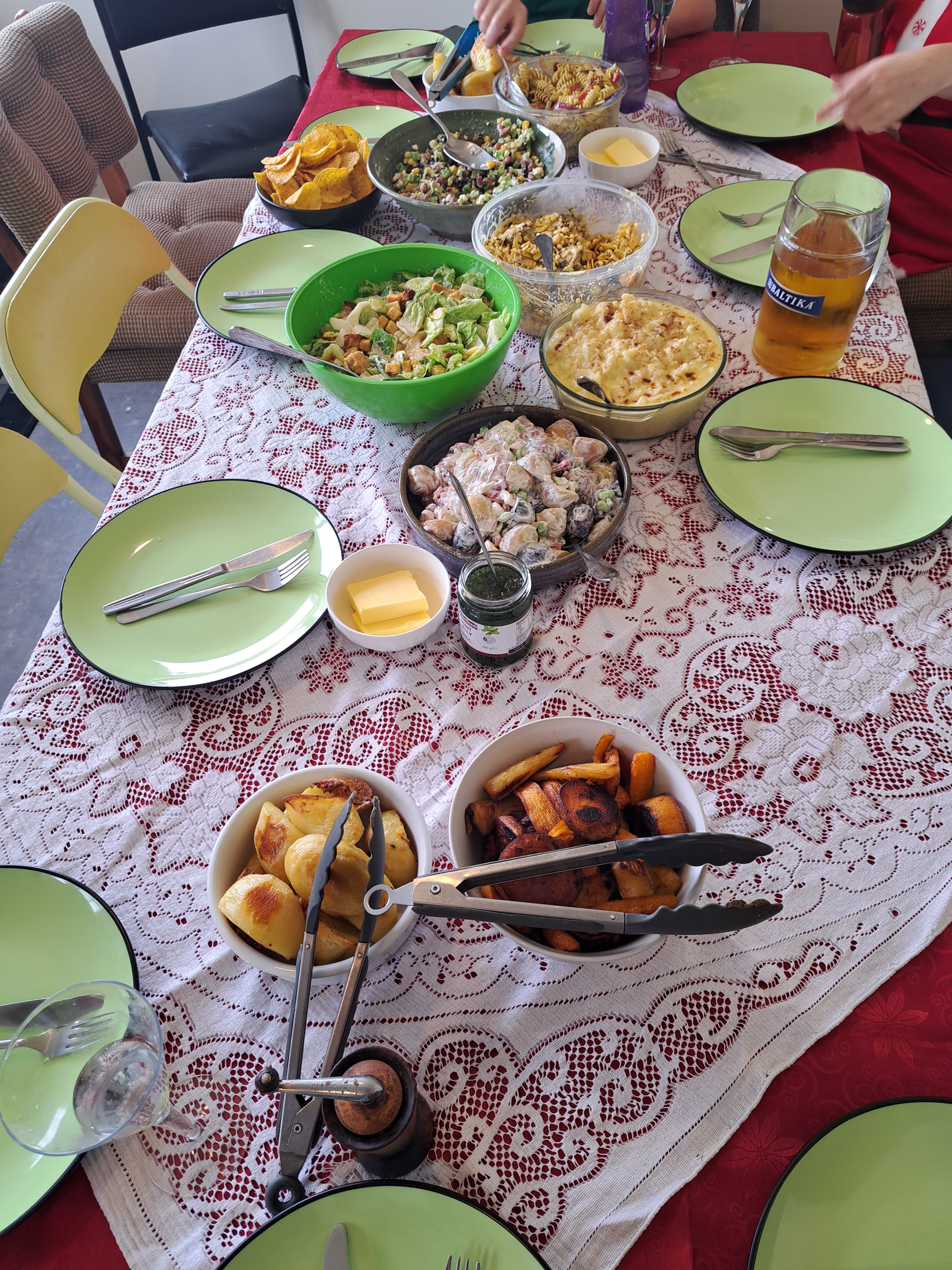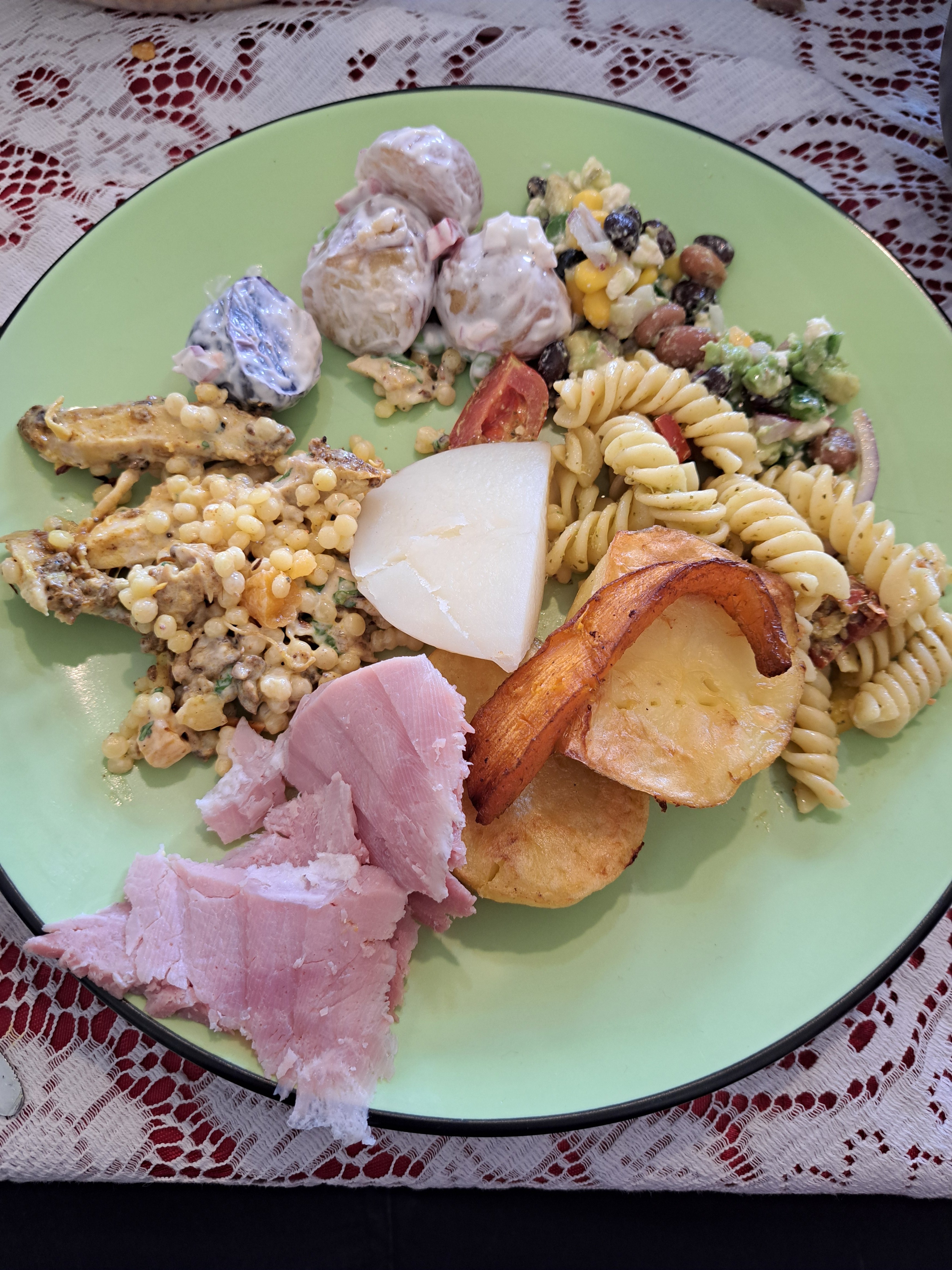 My plate. Olds had last lamb and other stuff from 1980s. Gen X and younger went for salads. Boomers and older roast lamb., spuds, cooked vegetables.