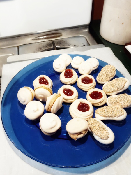 While they were drying, I made some fillings. For the cup-shaped cookies, I just phoned it in and filled them with some strawberry jam. For the disks, I made a dough out of 1 part maple syrup and 3 parts chunky peanut butter, and sandwiched it between two of the little "macarons" I had made. And for the ladyfingers, I got all kinds of fancy: I made a paste out of 1 part honey and 1 part tahini, spread it in a thin layer across the top of the ladyfingers, and then pressed the cookie into a bowl of toasted sesame seeds: