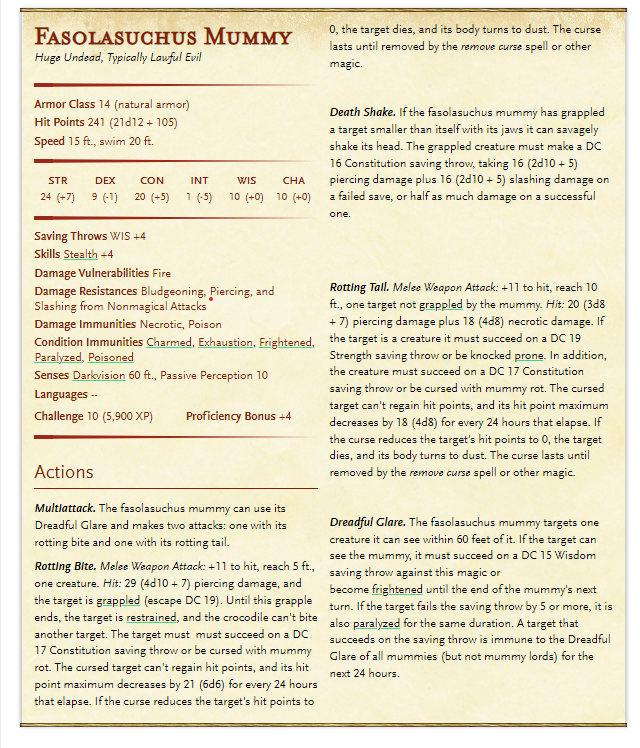 Rotting Death Shake. If the fasolasuchus mummy has grappled a target smaller than itself with its jaws it can savagely shake its head. The grappled creature must make a DC 16 Constitution saving throw, taking 16 (2d10 + 5) piercing damage plus 16 (2d10 + 5) slashing damage and 28 (8d6) necrotic damage on a failed save, or half as much damage on a successful one. In addition, the creature must succeed on a DC 17 Constitution saving throw or be cursed with mummy rot. The cursed target can't regain hit points, and its hit point maximum decreases by 14 (4d6) for every 24 hours that elapse. If the curse reduces the target's hit points to 0, the target dies, and its body turns to dust. The curse lasts until removed by the remove curse spell or other magic.