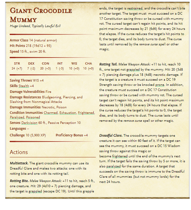 Actions, the bite and tail need the same damage tweaks as the Giant Croc, and its Death Shake should carry the rotting curse too.