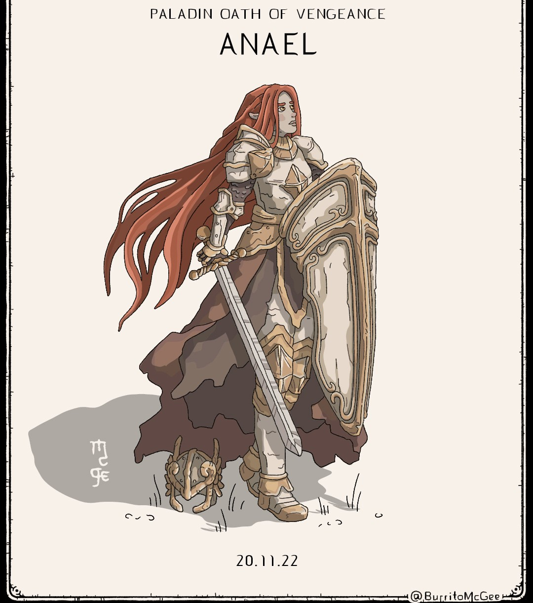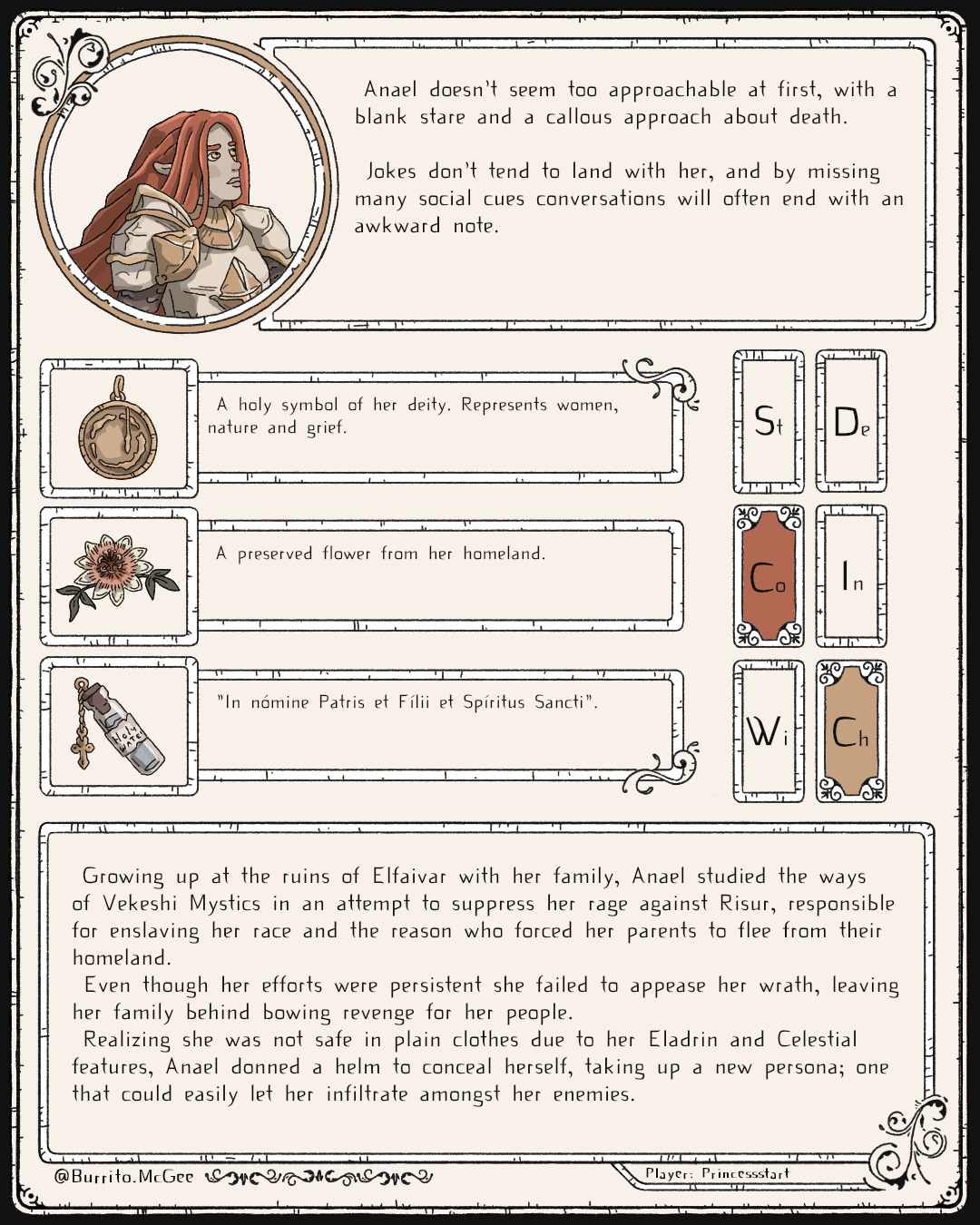 Character illustration and backstory of Anael, pronounced as (on-i-el)