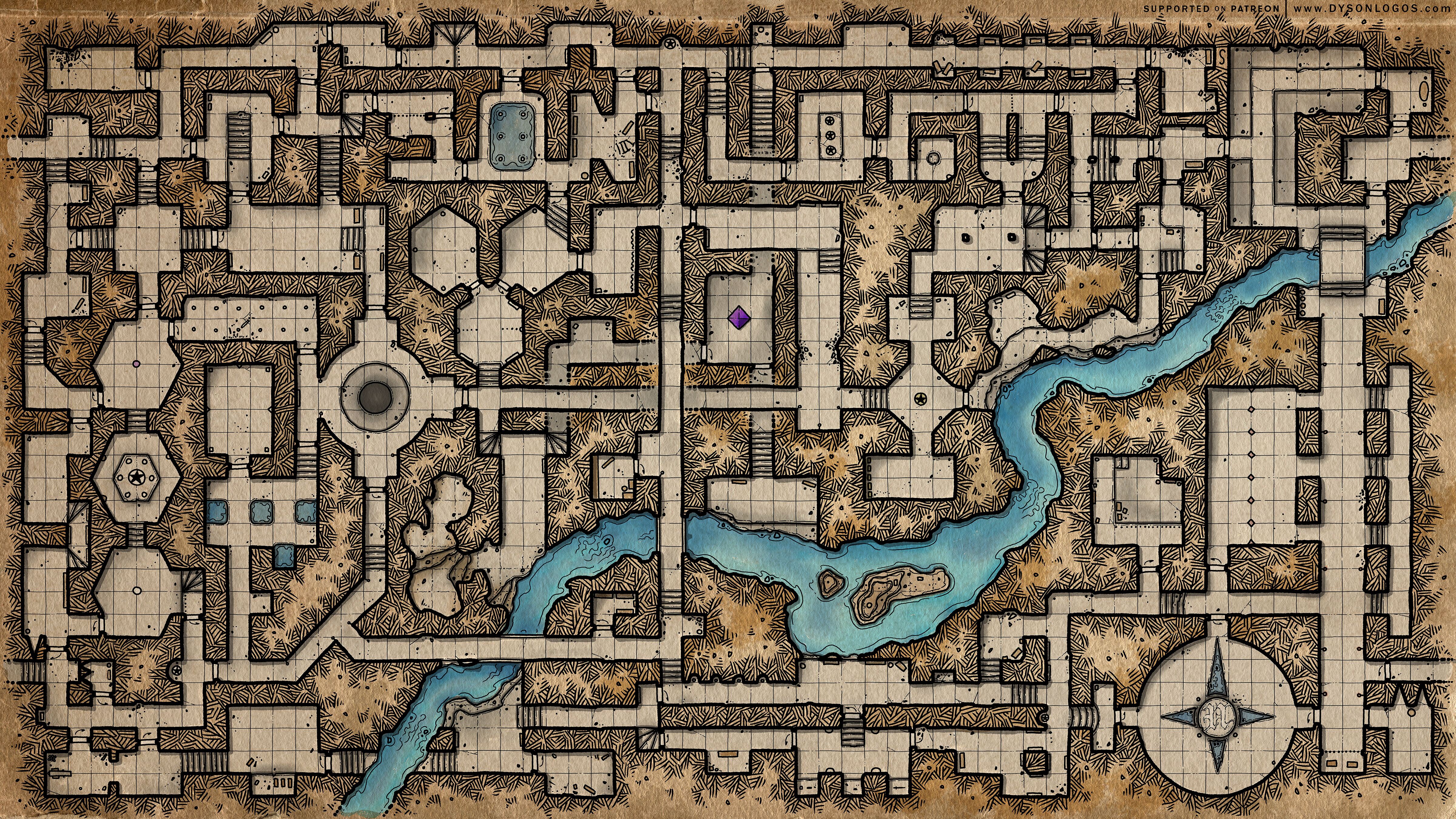 The actual design of this map was purely an exercise to fill a 16 x 9 inch page – the same ratio as a standard TV or monitor. Why? WALLPAPER! I currently use “The Halls of Geryon” as my desktop, but it gets cut off on the right and left sides. So I drew this (and another one I’m posting later this month) as potential replacements. As a display piece, it has a few “easter eggs”, the most obvious one being the compass rose appearing as an actual part of the structure.