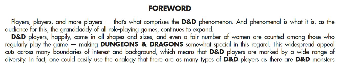 Y’know, something like that legacy content warning they put on all those old PDFs on DriveThruRPG. And when we see something bigoted in old D&D, we talk about it. It lets the new, broad, and deep tribe of D&D know that we do not want bigotry in D&D today. Talking about it welcomes the entire human family into the hobby.To do anything less is to damn D&D to darkness. It hobbles its growth, gates its community, denies the world the joy of the game, and denies its creators their due. D&D’s creators were visionary game designers. They were also people, and people are kinda ****** up. So a necessary step in making D&D the sort of cultural pillar that it deserves to be is to name its bigotries and prejudices when you see them. Failure to do so hurts the game by shrinking our community and therefore shrinking the legacy of its creators.