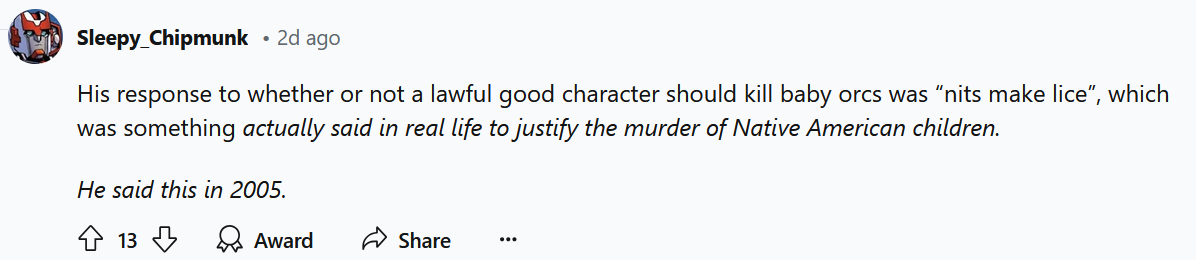 Y’know, something like that legacy content warning they put on all those old PDFs on DriveThruRPG. And when we see something bigoted in old D&D, we talk about it. It lets the new, broad, and deep tribe of D&D know that we do not want bigotry in D&D today. Talking about it welcomes the entire human family into the hobby.To do anything less is to damn D&D to darkness. It hobbles its growth, gates its community, denies the world the joy of the game, and denies its creators their due. D&D’s creators were visionary game designers. They were also people, and people are kinda ****** up. So a necessary step in making D&D the sort of cultural pillar that it deserves to be is to name its bigotries and prejudices when you see them. Failure to do so hurts the game by shrinking our community and therefore shrinking the legacy of its creators.