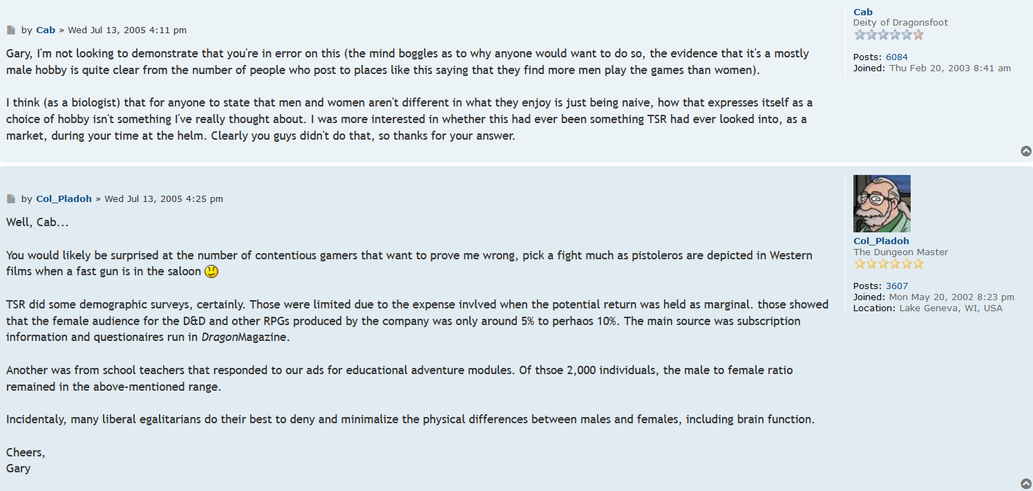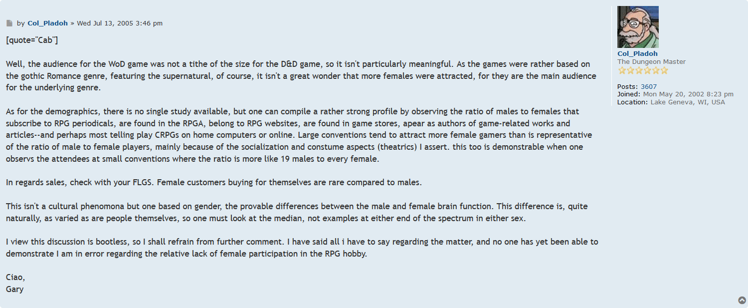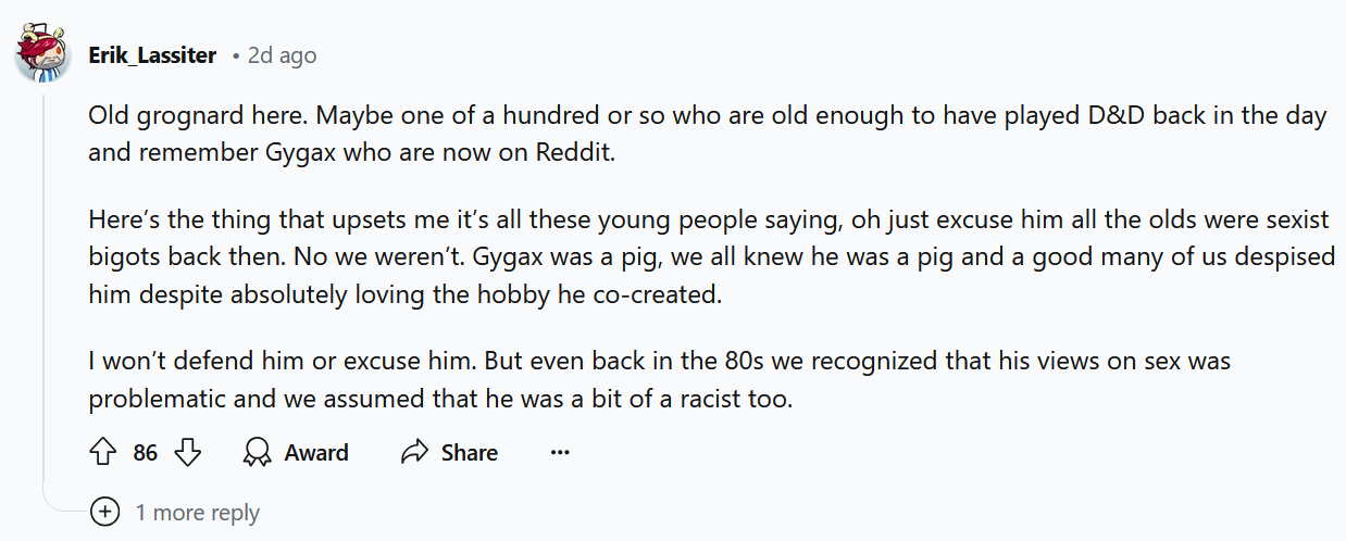 What if for some the notion of Gygax being a product of his time isn't to excuse his sexism, but rather to excuse D&D for being made by a sexist?