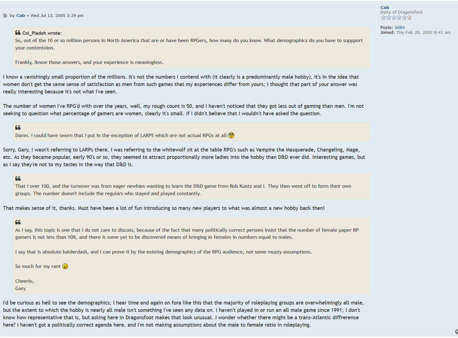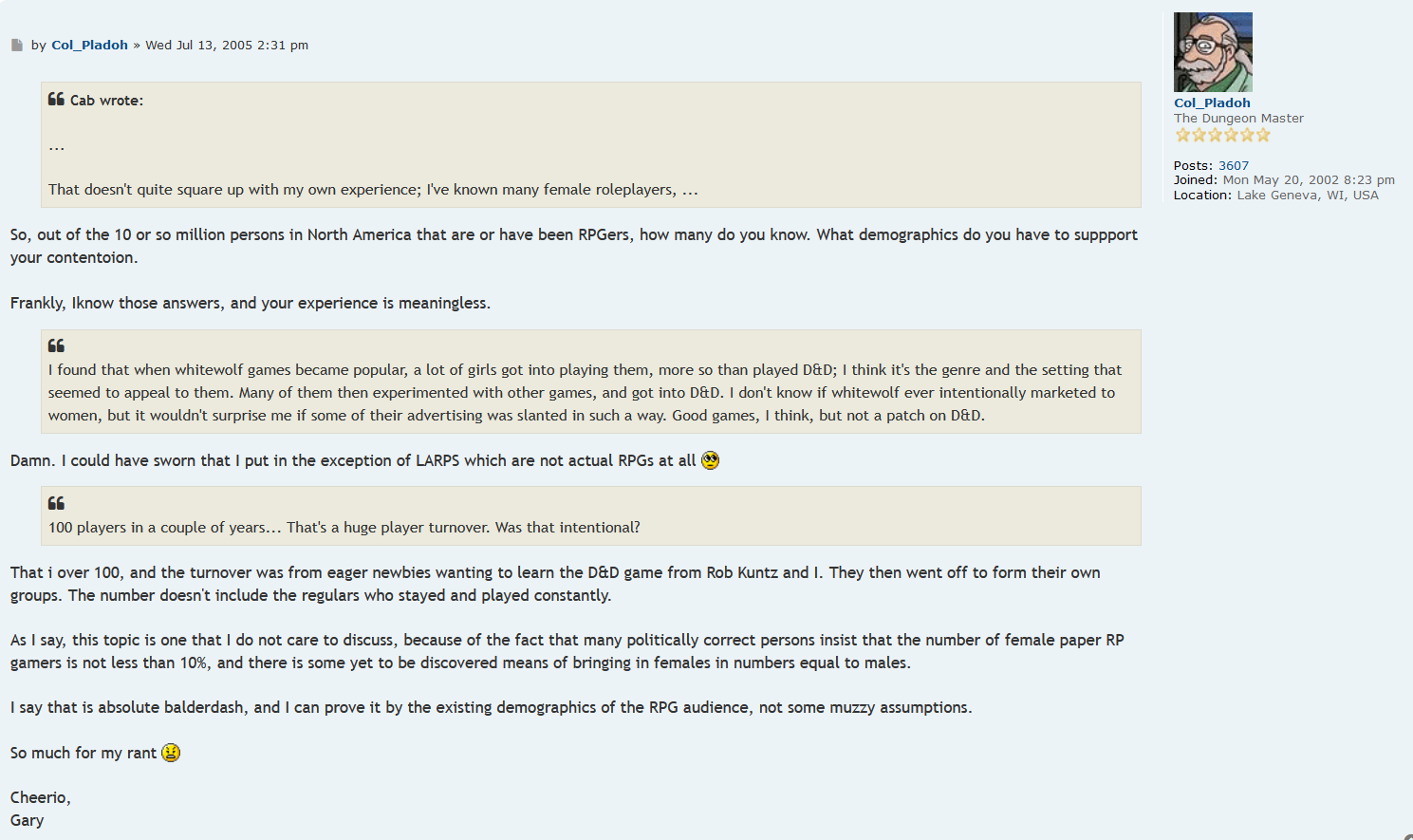What I'm saying it even with those comments he would still be father if the year material comparatively. I just experienced the drunken rage part of things. I saw and experienced so much worse than Gary's comments 10-20 years after thise quotes. Those men and some women were contemporary with him. And they weren't the worst examples.