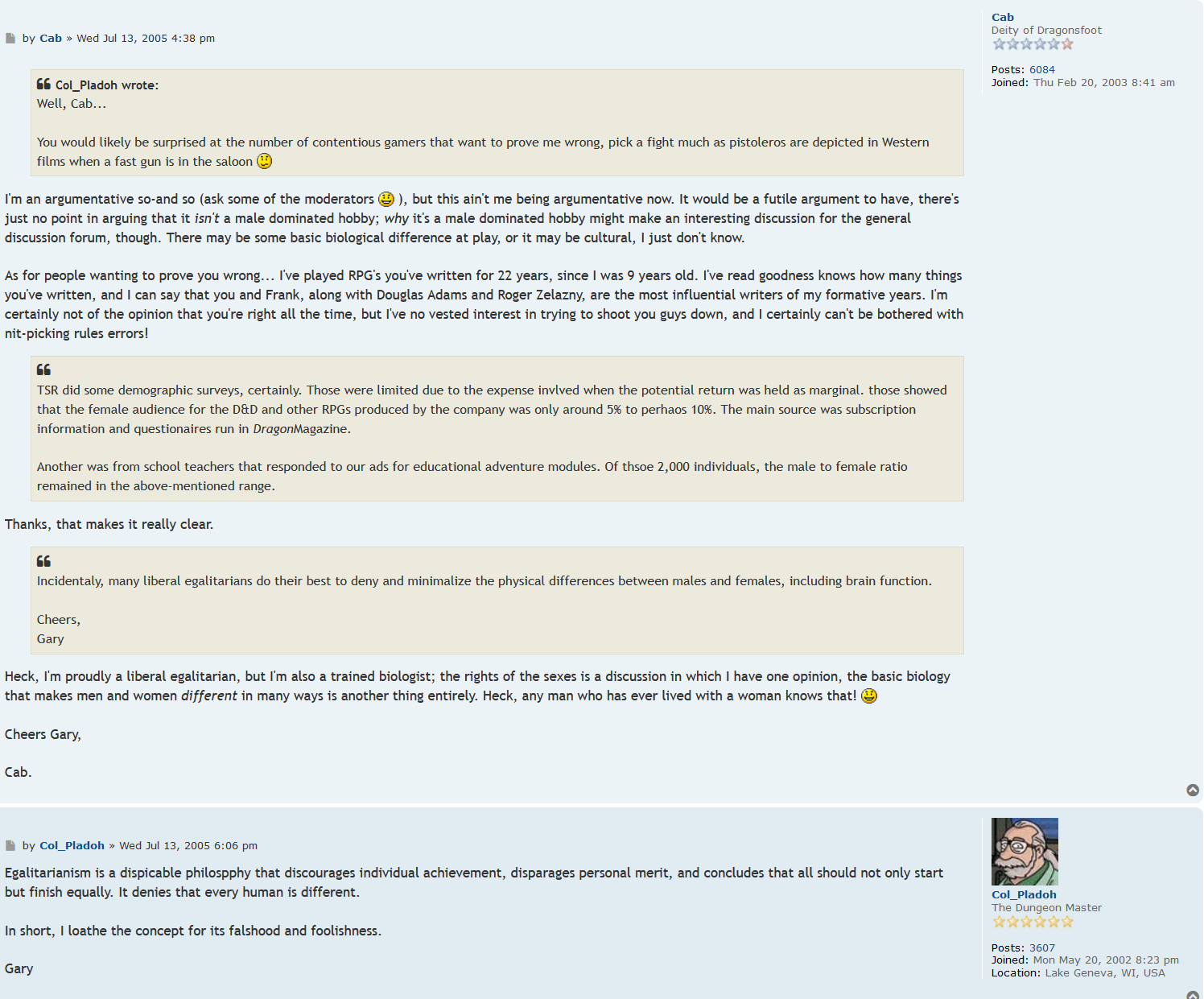 Gary Gygax poo-pooing the idea that all people are created equal and should be treated fairly.
