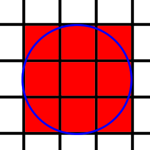 Blue is a circular effect, red is all squares effected within that effect.