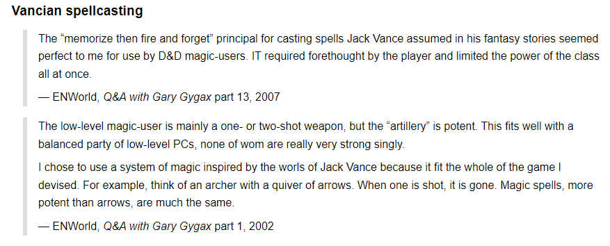 To my mind, one just resists the initial impulse that a simulation must have a preexisting reference. One motive for doing so is that otherwise one unreasonably excludes game creation as a form of imaginative expression in its own right. In the past, Jo Writer wrote stories about worlds they imagined. Now and in future, Jo Designer will craft games about worlds they imagined.You're trying to make a narrow focused discrimination based on motivation and thought process for the origin of fiction. I don't see the point, it's still total fiction. In addition D&D's magic is called Vancian magic because Jack Vance came up with the concept first. Gygax and Arneson may or may not have picked it because it also served their purposes, but they did not invent the idea.