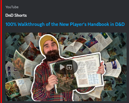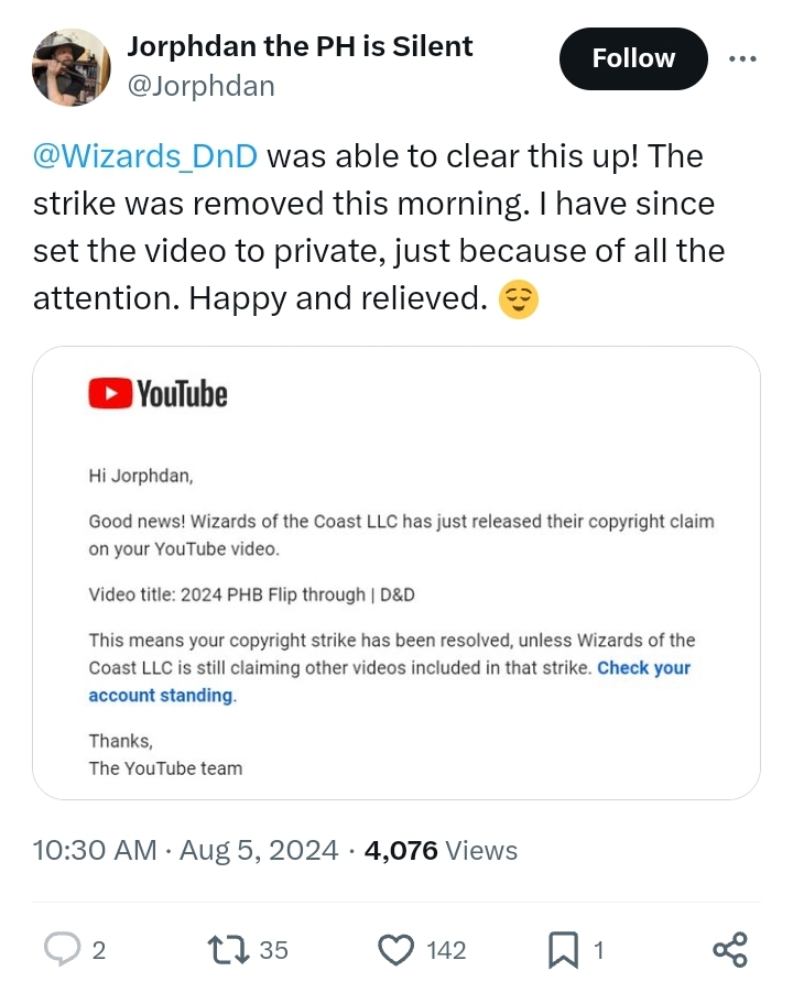 Jorphdan posted on Twitter that "Despite fulfilling [WotC's] requests for the flip through video I was issues a copyright strike on my channel. Three strikes TERMINATES your channel. I don't think going over the 2024 PHB is worth losing my channel I've been working on since 2017. I'm pretty upset as none of this was said up front and when notified I did comply with their requirements. And I see other creators still have their videos up. Videos that are not unlike mine. Covering WotC is not worth losing my channel... Meanwhile please subscribe to my D&D free channel the Jocular Junction, where I'll most likely be making the majority of my TTRPG videos."