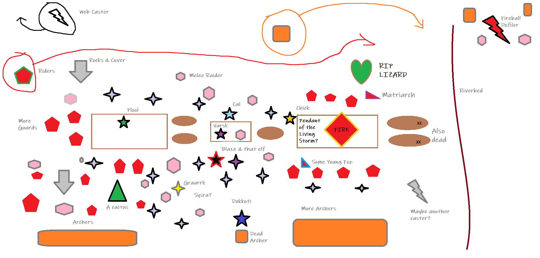I never specified if the slave coffle was N or S of the Caravan, one way is as good as another, but the Inix traveled the opposite direction, to get out of FB blast area. It is probably near the upper fireball caster location.