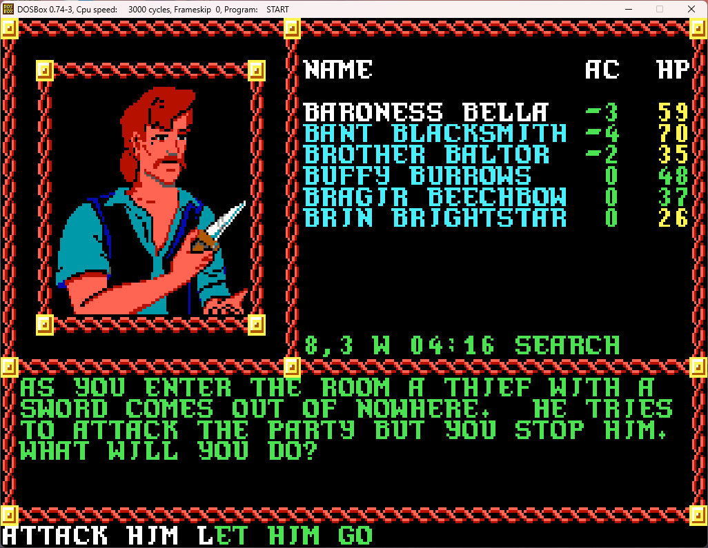 As the battle starts, they've moved from two organized lines to flanking me, all during the surprise round. The thieves come in two types, the 1st-level thieves with 4 HP and the tougher, but thankfully less numerous, 6th-level thieves with 28 HP. Also, don't let them get behind you! A backstab, especially by the 6th-level thieves, can be very unpleasant!