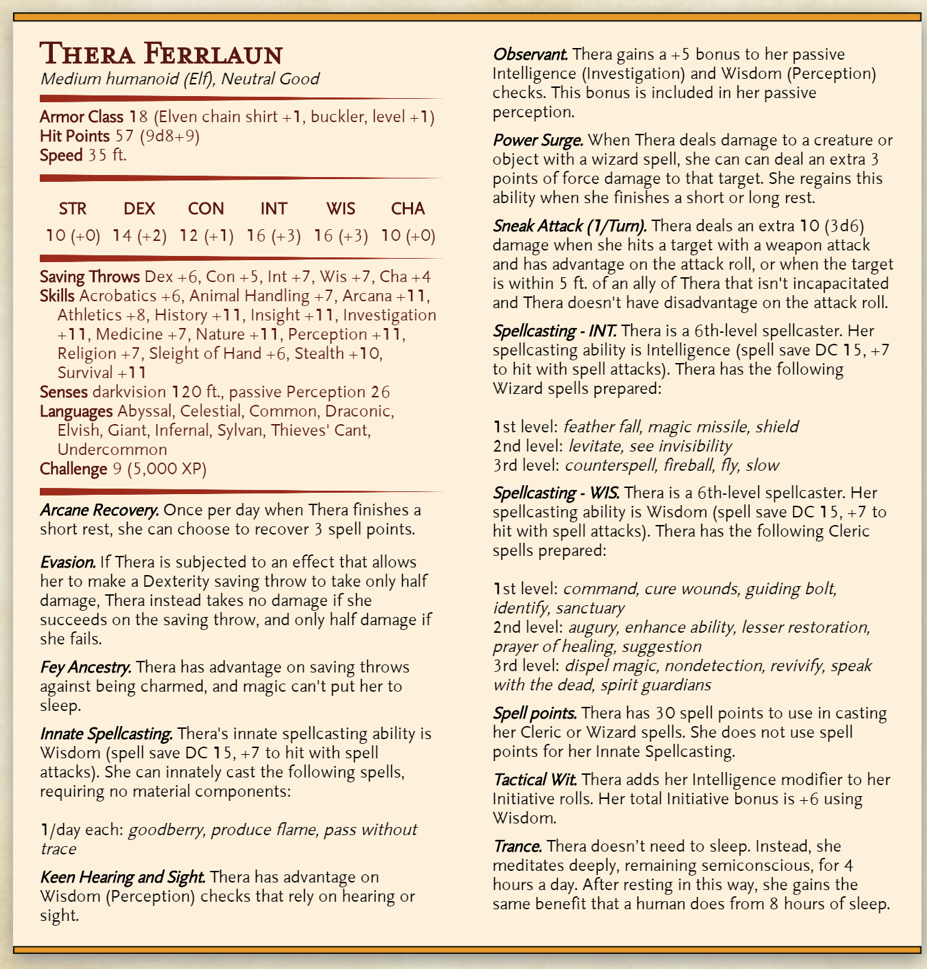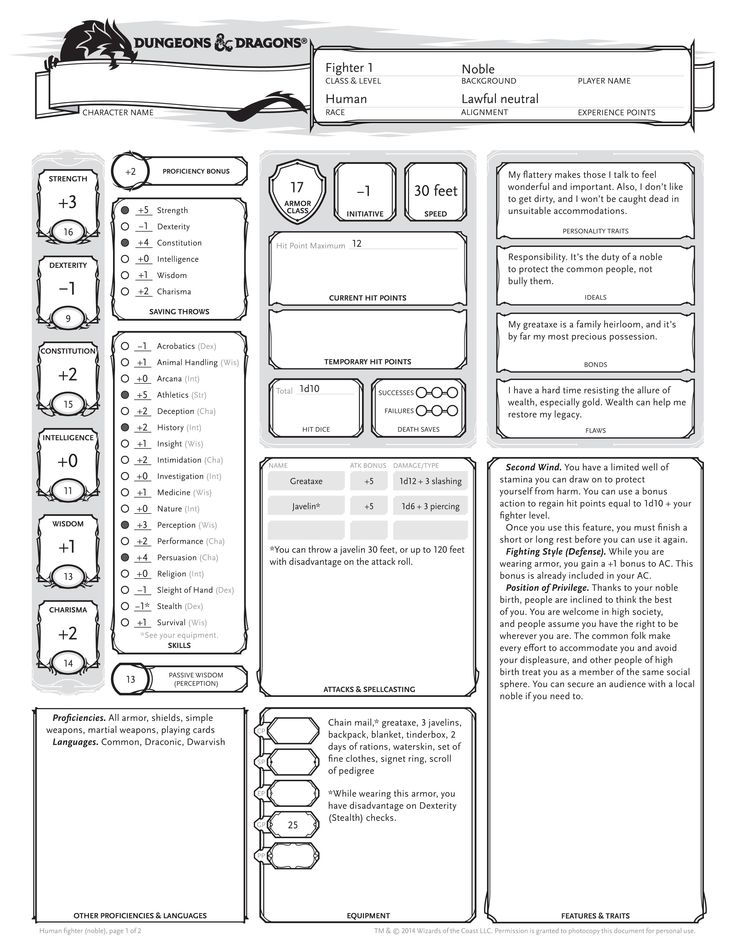 To illustrate my point, here's a standard character sheet compared to a statblock-style character sheet. I think the latter is much more usable and convenient for keeping track of what you can do on a turn, which makes it easier to juggle your options as they increase at higher levels. The more traditional sheet can be much more disorganized and hard to use since a lot of info is going to be penciled into features and traits over time without an intuitive way to sort through them.