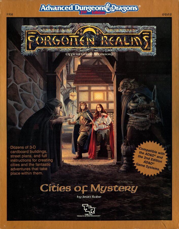 I believe the largest set of paper buildings was in 1989’s Forgotten Realms Cities of Mystery. There were also some with a couple hybrid “AC” Basic D&D products, IIRC.