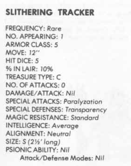 "Ed Greenwood presents "The Ecology of the Slithering Tracker," offering fresh insight into this underutilized predator. Delivered as the notes of the wizard Aluthandee, the article describes the monster's appearance, hunting tactics, and reproduction. Greenwood now has these articles down to a fine formula, including an evocative piece of fiction with the game information in the endnotes and an appendix. The slithering tracker first appeared in 2E and then was dropped, reappearing in 5E." underutilized indeed! However, it's from the 1e monster manual