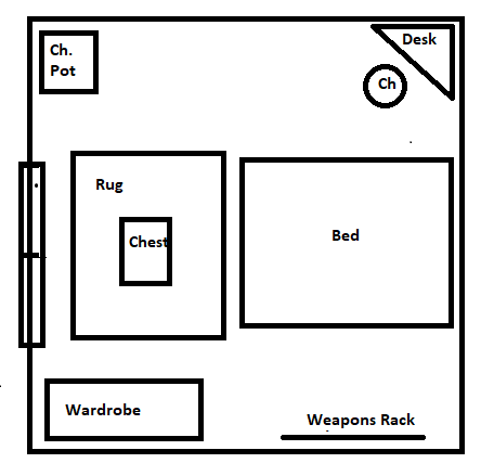 The doors to the 20'x20' room are barred from the inside if the room is occupied (2am-6am meditating, 20% chance at other times unless Eleandra has already been met). It is hard to break in (DC 25 Str) but easy to pick through the very thin crack in the door from the outside. However the several small bells resting on the bar are pretty much impossible to non-magically stop from falling off unless some sort of clarivoyance is used to see that they are there. There is a large canopied bed against the opposite wall, the south wall has a wardrobe and a weapons rack. The north wall has a small stand with a chamber pot inside of it and a writing desk with a chair. Right in front of the door is a large rug with a very valuable chest in the middle.