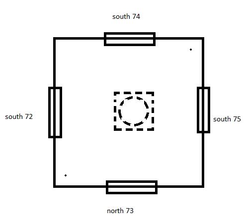A 15' x 15' room with a trapdoor in the center of the floor, a grate in the center of the ceiling, and doors in the center of each wall. Only the north door is locked.
