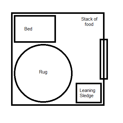 Her room has a comfortable bed with a chamber pot beneath it, a large circular rug, her personal supply of a week's food, and a large sledge with greased skis leaning up against the wall (if she is not out using it). On the first day of each week she ventures to the front gate and gathers several sledge fulls of food and supplies that she distributes to the rooms in the upper portions and heaves down to the lower ones. It isn’t serving in Valhalla, but what else cuts the boredom? Sometimes she can't stand her routine (or cowardice?) and answers a challenge when she is dumping a delivery to the lower levels, or bathes in the great pool (room # coming) daring anything to interrupt her ablutions. Otherwise, she meditates or practices in her room, or sometimes in the infinite tunnel (room 58).
