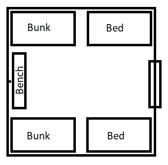 This 15’x15’ room has a sign that says “Open for Boarders. Knock on the Rose Door” (not in the same handwriting as in the South Fae Hall). It is unlocked but has a bar (DC 14 to break through) on the inside if wanted. For sleeping the room contains two beds, two bunk-beds, a bench to sit on, and two chamber pots under it.
